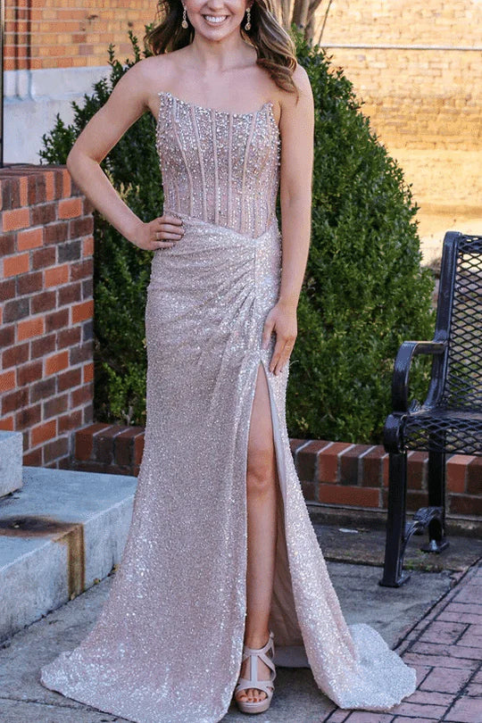 Strapless Mermaid Beaded Pleats Sleeveless Sequins Prom Formal Dress