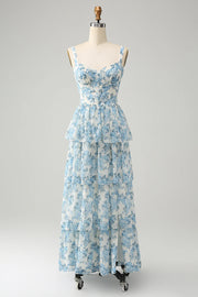 White Blue Flower A Line Spaghetti Straps Print Tiered Long Bridesmaid Dress
