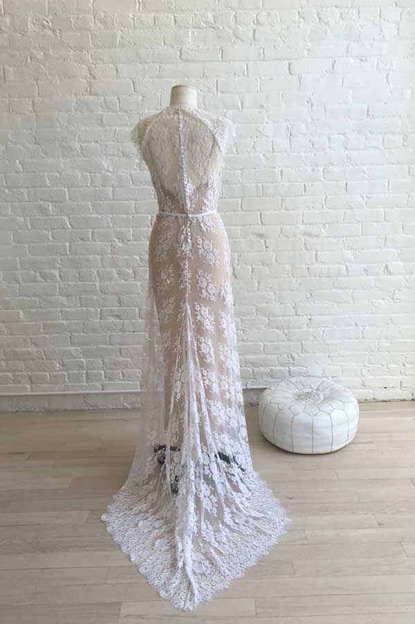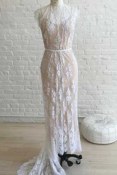 White Sheath Sweep Train Sleeveless Lace Wedding Dresses