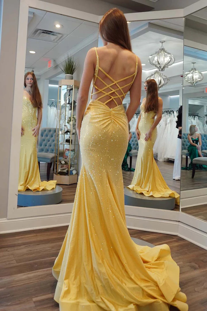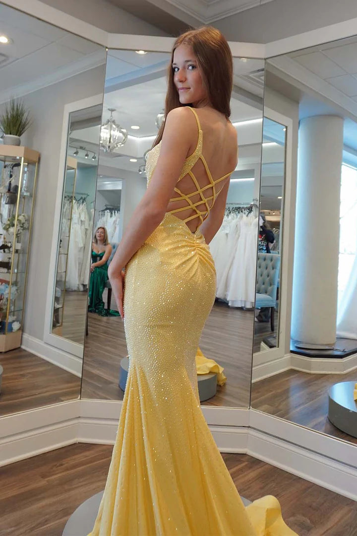 Yellow deep v backless beaded ball dress floor length skirt